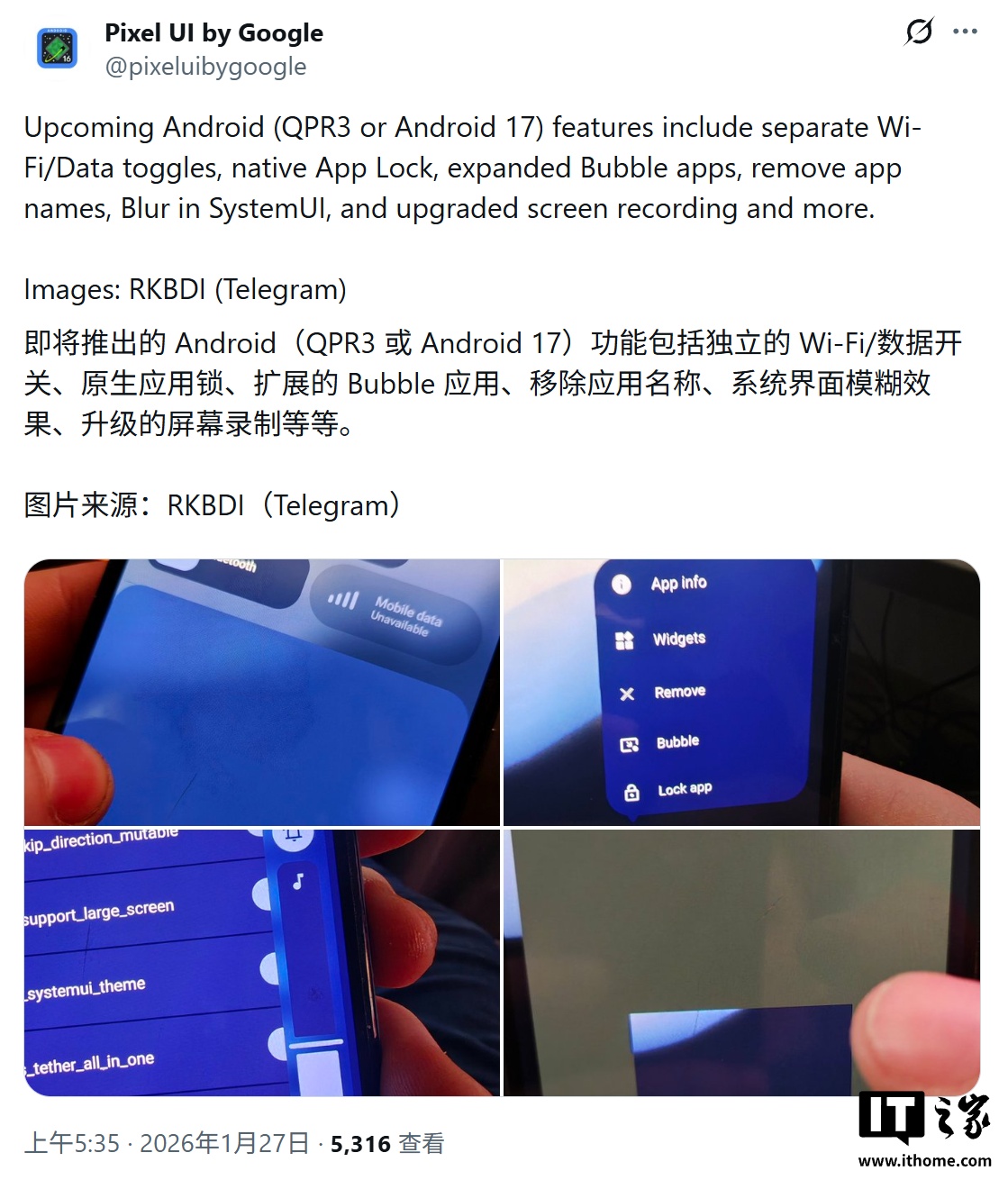 1 月 27 日消息,消息源 @RKBDI 今天(1 月 27 日)在 X 平臺發布推文,分享了一組截圖,展示了谷歌安卓 17 內部構建版本,聚焦 UI 視覺與功能交互上的變化。