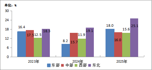 圖5-2 2023—2025年東、中、西、東北地區移動互聯網接入流量增速情況