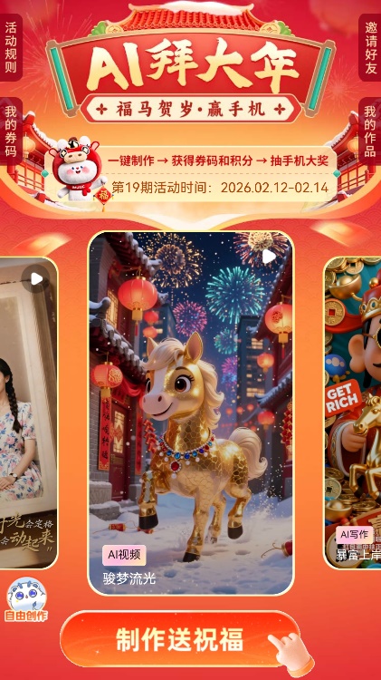打開小程序,春節氛圍撲面而來。“八方來財”“馬上大吉”“馬上轉運”……的吉祥話、“卡通拜年合家歡”“Horse(好事)成雙”的拜年場景……一片紅紅火火。