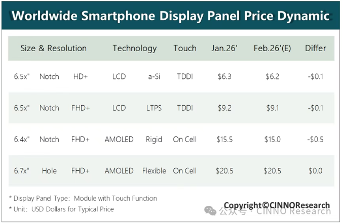 2 月 23 日消息,據(jù) CINNO Research 最新報告,受春節(jié)假期及傳統(tǒng)淡季影響,2026 年 2 月手機市場整體表現(xiàn)低迷。與此同時,上游存儲器價格持續(xù)大幅上漲,顯著推高整機 BOM 成本,終端品牌紛紛下調(diào)出貨目標(biāo)以控制成本。在此背景下,手機面板市場延續(xù)疲軟態(tài)勢,各技術(shù)類型的手機面板價格均面臨不同程度的下行壓力。