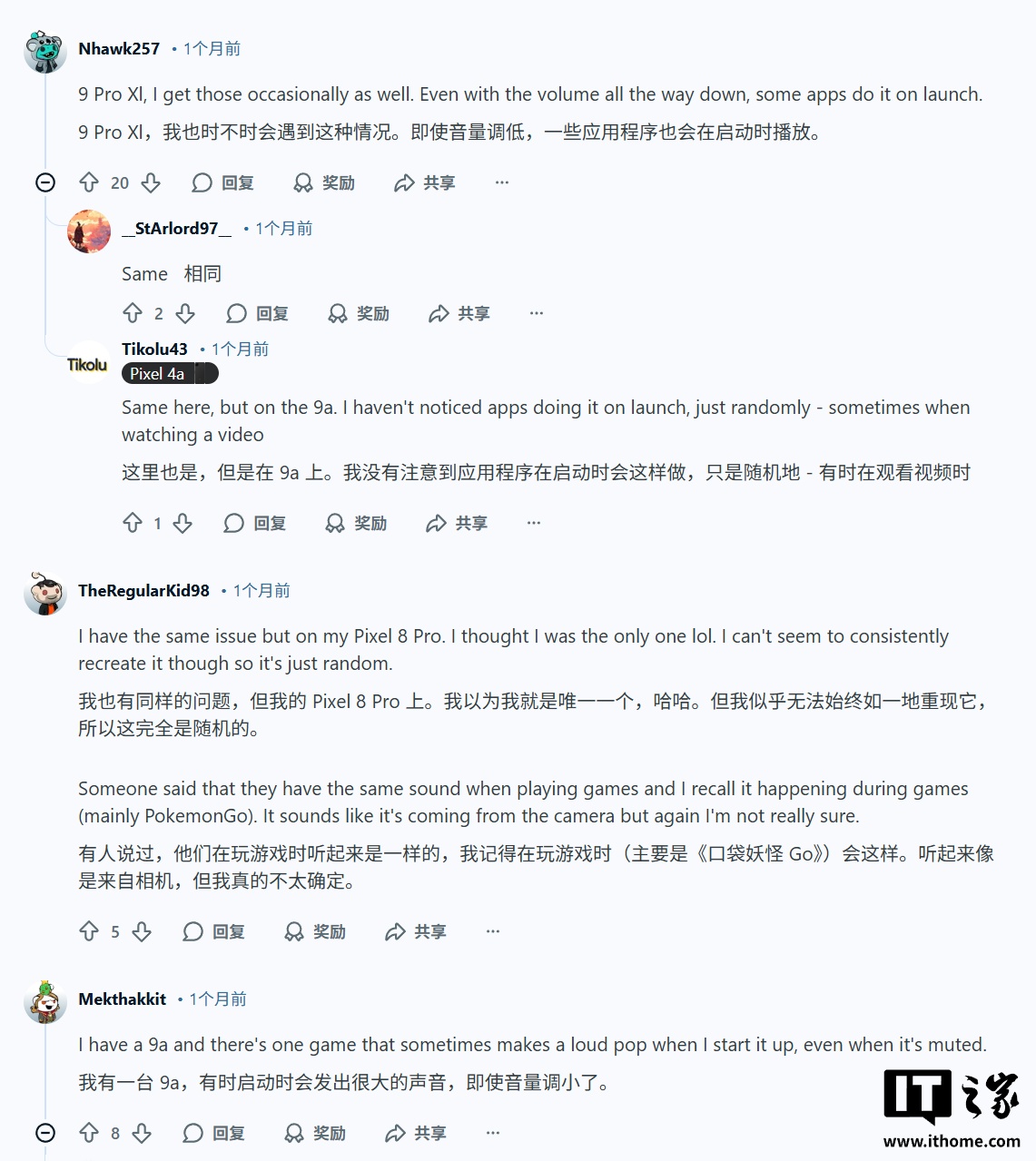 根據(jù)多名用戶(hù)在 Reddit 社區(qū)發(fā)文,這些爆音是隨機(jī)出現(xiàn)的,而且音量飄忽不定,有時(shí)候可能會(huì)相當(dāng)響,隨后有許多用戶(hù)在評(píng)論區(qū)表示,自己的 Pixel 10 Pro、Pixel 9、Pixel 8 和 Pixel 7 都遇到了類(lèi)似問(wèn)題,表明這種故障并非局限于某一款機(jī)型。