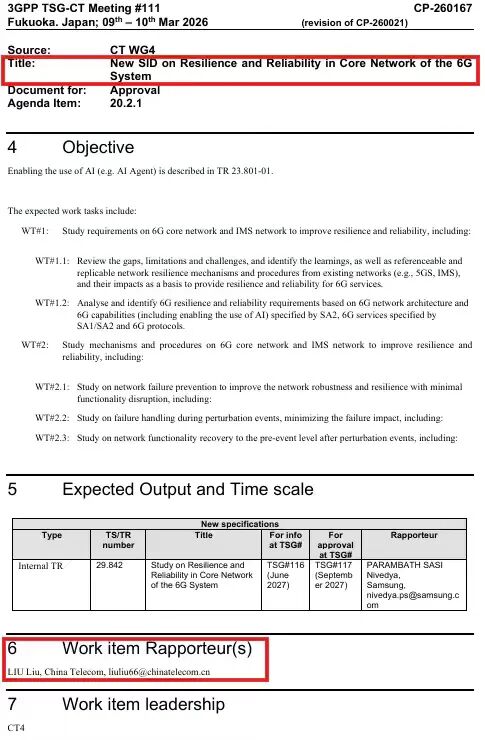近日,3GPP核心網與終端技術規范組(TSG CT)第111次全會在日本福岡舉行。會上,由中國電信牽頭的“6G系統彈性和可靠性研究”項目成功獲批立項。該項目由中國電信研究院核心網技術研究所90后青年骨干劉柳擔任報告人,是中國電信在3GPP CT領域牽頭的首個6G網絡標準項目,也是本次會議首批通過的四個6G項目之一。