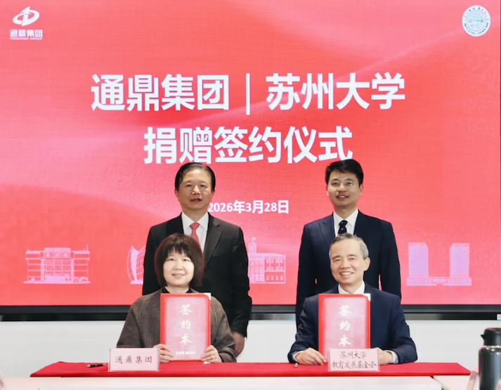 2026年3月28日下午,通鼎集團向蘇州大學捐贈簽約儀式在蘇州大學文體中心會議室隆重舉行。蘇州大學校長張橋,黨委副書記、副校長沈明榮,王健法學院黨委書記朱春霞,校長辦公室副主任(主持工作)蔣宇,國內合作發展處處長、教育發展基金會秘書長程曉軍等部門和院系負責人參加活動。儀式由程曉軍主持。中國慈善聯合會、中國企業改革與發展研究會副會長、通鼎集團有限公司董事長沈小平,通鼎集團有限公司總經理錢慧芳等企業方代表出席活動。