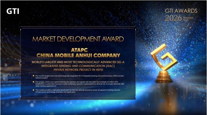 近日,在MWC2026巴塞羅那世界移動通信大會期間,由安徽移動聯合國際先進技術應用推進中心(合肥)(簡稱國先中心)打造的合肥5G-A通感一體(ISAC)專網項目,成功斬獲GTI Awards 2026“市場發展獎”。這一獎項是對安徽移動和國先中心在5G-A技術創新、低空經濟產業落地及商業生態構建方面突出貢獻的高度認可,也標志著我國5G-A賦能低空經濟的“合肥模式”走向全球,成為國際低空智聯發展的標桿。