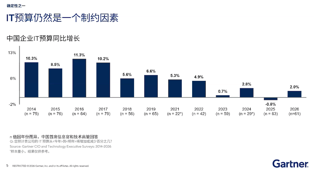 飛象原創(chuàng)(魏德齡/文)“砍預(yù)算了。”這可能是近年來,經(jīng)常聽到的一話。Gartner的數(shù)據(jù)也印證了這點(diǎn),自2014年開始,中國企業(yè)的IT預(yù)算占比基本維持在10%左右,但在2018年開始逐步下跌,2025年甚至達(dá)到最低點(diǎn)-0.8%,今年來到2%。